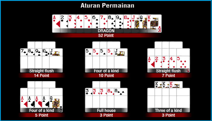 - 2,3,4,5,6,7,8,9,10,J,Q,K,A disebut Dragon angka terbesar dalam permainan Capsa Susun